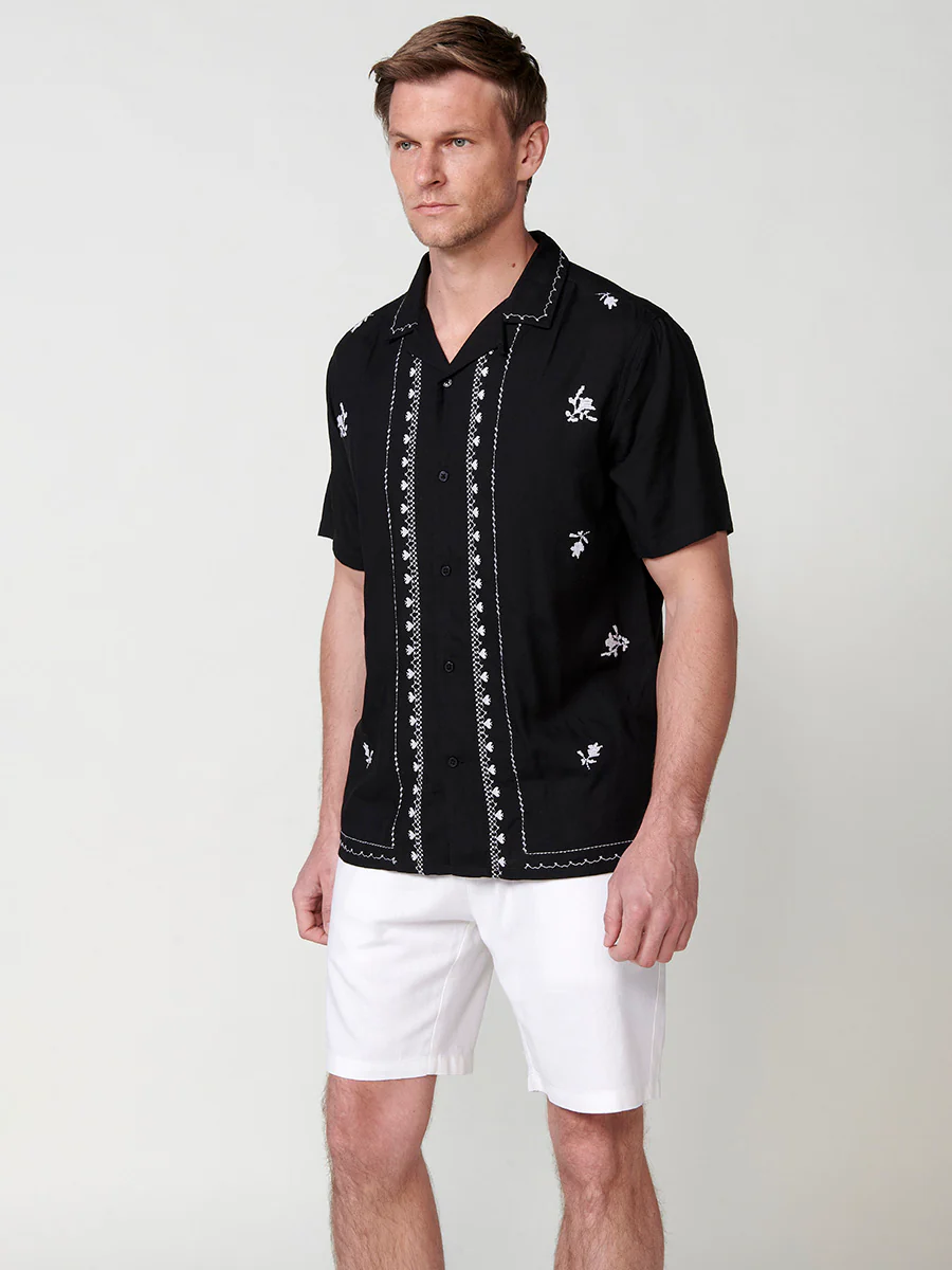 Si buscas una prenda que combine estilo, comodidad y calidad, esta camisa de manga corta negra es la opción ideal. Con su elegante cuello pico, los detalles bordados y la suavidad de su composición en viscosa, esta camisa será una de tus favoritas para cualquier ocasión. No te pierdas la oportunidad de añadirla a tu colección y lucir siempre a la moda.