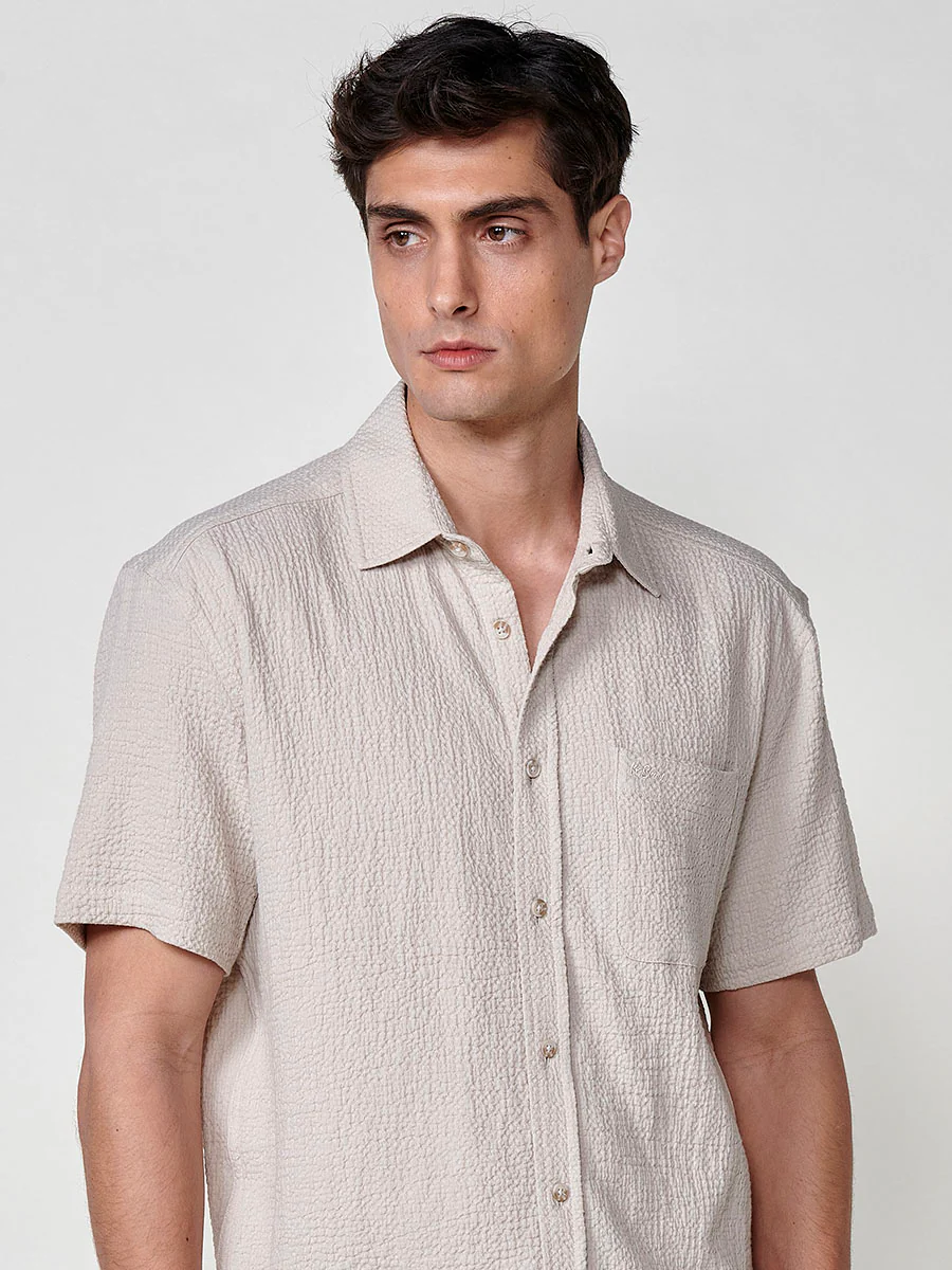 La camisa de manga corta de Koröshi es una prenda que combina estilo minimalista con un toque de textura, perfecta para quienes buscan un look sobrio pero con personalidad. Confeccionada en 100% algodón, su tejido texturizado aporta un acabado original y cómodo, ideal para el verano o climas cálidos.