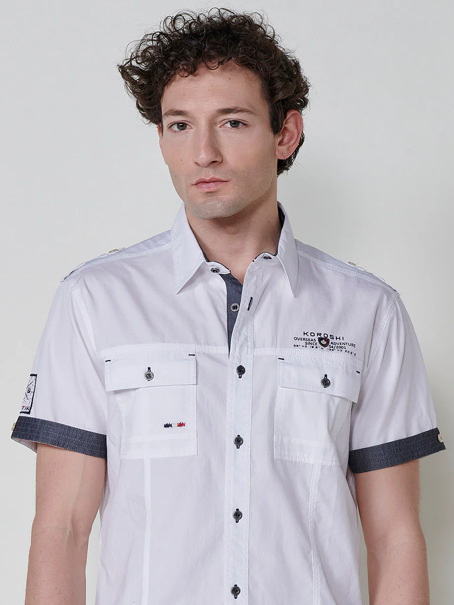 Camisa de manga corta de algodón. puños vueltos, cierre con botones y bolsillos con solapa.