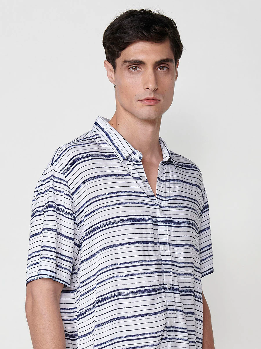 La camisa de manga corta de Koröshi es una opción perfecta para los días cálidos gracias a su tejido ligero y fluido de viscosa. Con un diseño sencillo y funcional, aporta un toque moderno y fresco al look masculino.