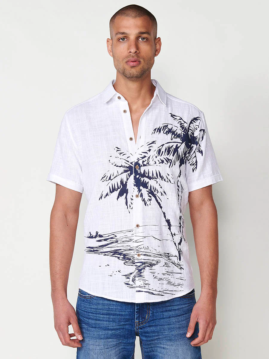 Con esta camisa blanca de manga corta con estampado tropical, no solo disfrutarás de la comodidad del algodón, sino que también proyectarás una imagen de estilo relajado y moderno. ¡Hazla tuya y añade un toque de frescura tropical a tu armario!