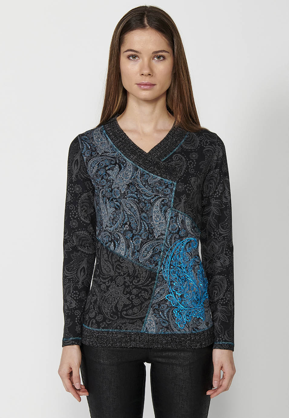 Camiseta de manga larga confeccionada en 100% algodón con cuello pico y ribete cruzado. El bordado delantero añade un toque de sofisticación a este diseño versátil. Suave, transpirable y duradera, es perfecta para combinar con jeans en looks casuales o con faldas para ocasiones más formales. Una prenda esencial que se adapta a cualquier estilo.