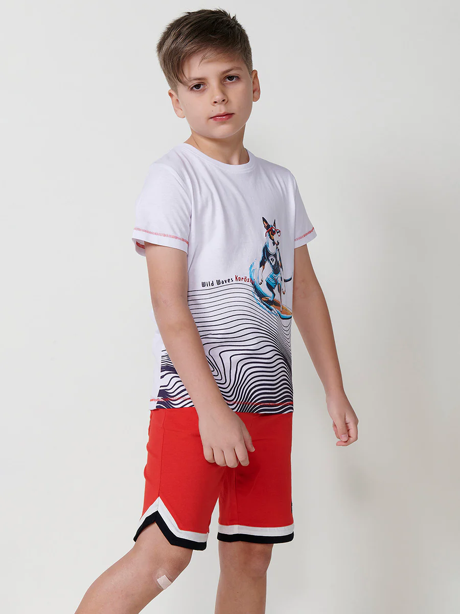 Camiseta de niño de algodón con estampado de ondas y perro surfero