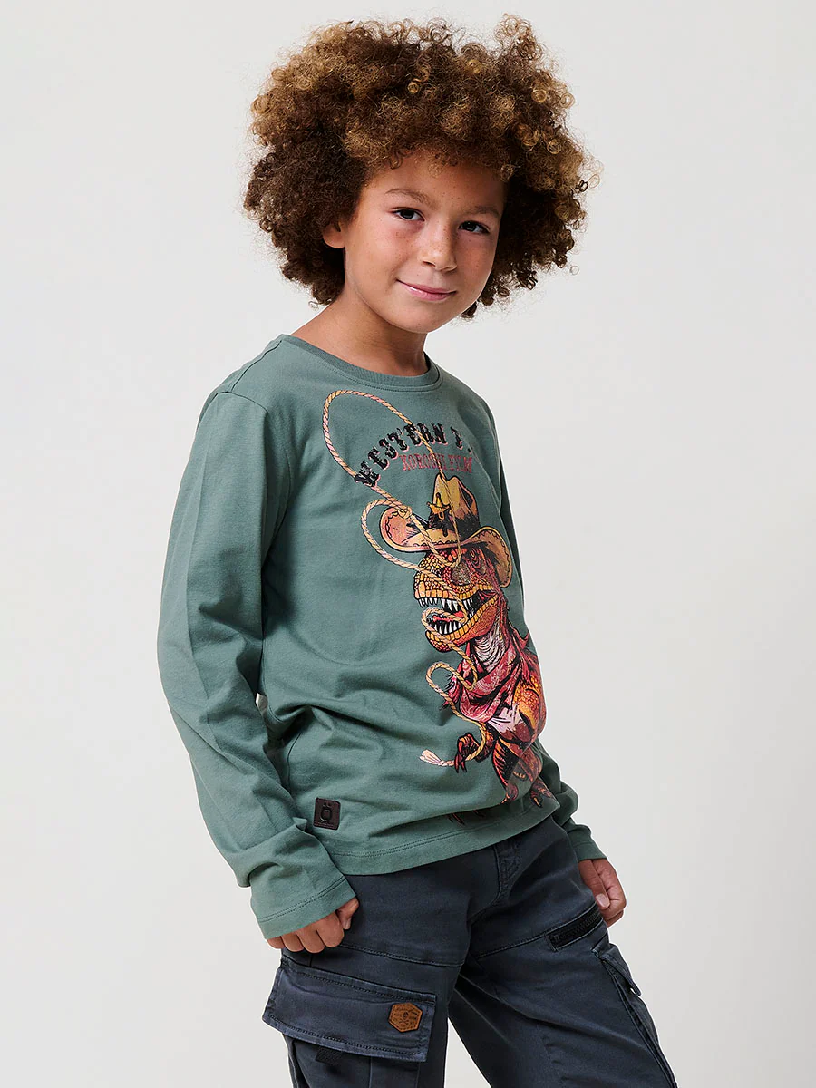 Camiseta de niño en , confeccionada en 100% algodón suave y cómodo. Presenta cuello redondo de canalé a tono, manga larga y estampado delantero de dinosaurio que aporta un toque divertido y original.