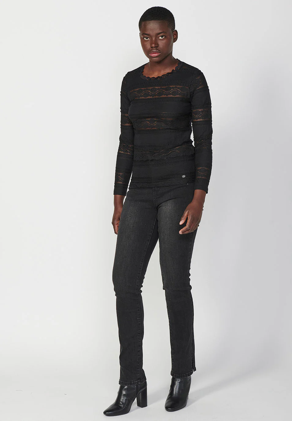 Camiseta manga larga cuello redondo y borde de encaje tejido puntilla mujer
