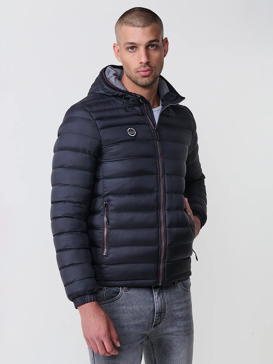 Chaqueta cazadora acolchada tipo plumífero hombre, cuello alto capucha, bolsillos y cierrecremallera.