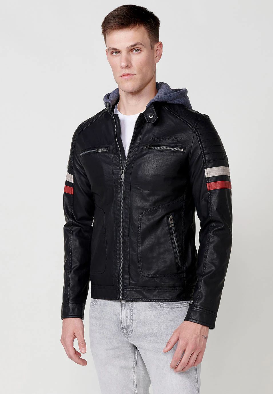 Descubre la cazadora efecto piel para hombre de la marca Koröshi, una prenda imprescindible para quienes buscan estilo, versatilidad y funcionalidad en un solo diseño. Esta cazadora, de clásico, está confeccionada con materiales de alta calidad, ofreciendo un aspecto moderno y sofisticado, ideal para complementar cualquier outfit urbano o casual.