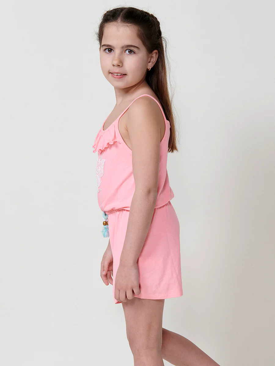Mono corto niña rosa koröshi de algodón con volante y detalles de mariposa