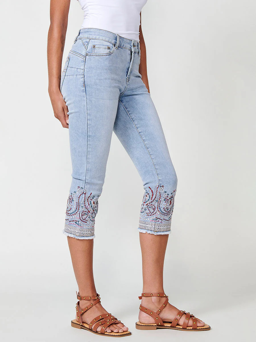 Pantalón jeans capri elástico con doble push-up y bordado étnico en claro para mujer