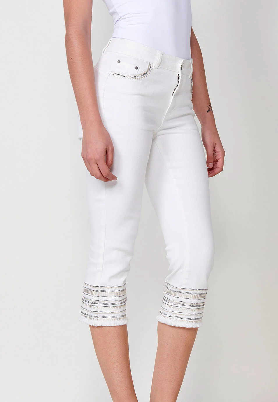 Su diseño de cinco bolsillos funcionales aporta practicidad, mientras que el cierre con cremallera y botón metálico garantiza un ajuste seguro y cómodo. El bajo deshilachado con bordado de cenefa combinado con brillos le da un toque elegante y distintivo, ideal para looks sofisticados y femeninos.