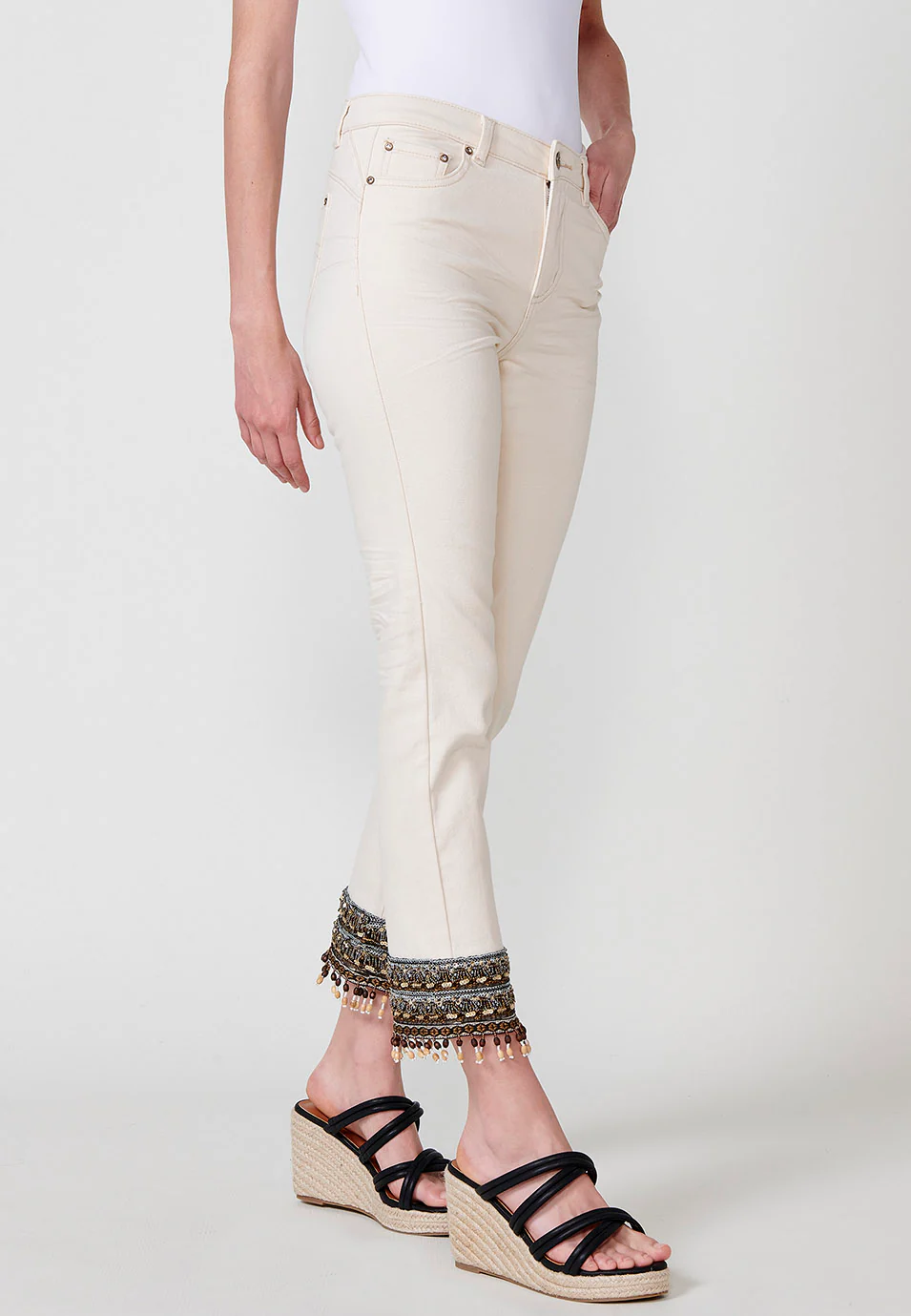 Su diseño clásico de cinco bolsillos funcionales aporta practicidad, mientras que el cierre con cremallera y botón metálico garantiza un ajuste seguro y estilizado. Como detalle exclusivo, este pantalón incorpora bordados con lentejuelas, flecos con abalorios y bolas de madera en el bajo, agregando un toque bohemio y sofisticado que marca la diferencia.