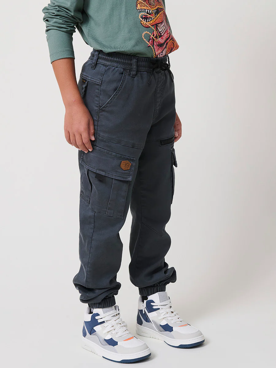 Pantalón jogger de niño en knit denim elástico color verde con bolsillos cargo. 100% algodón, cómodo y moderno.