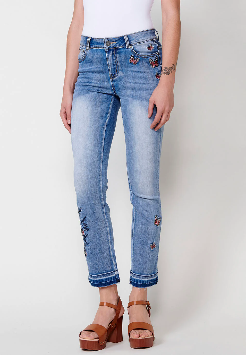Descubre el pantalón largo jeans recto que añade un toque de estilo y originalidad a tu armario. Diseñado en un clásico con delicados detalles bordados de flores y mariposas, este pantalón es ideal para la mujer que busca destacar con un look sofisticado y femenino.