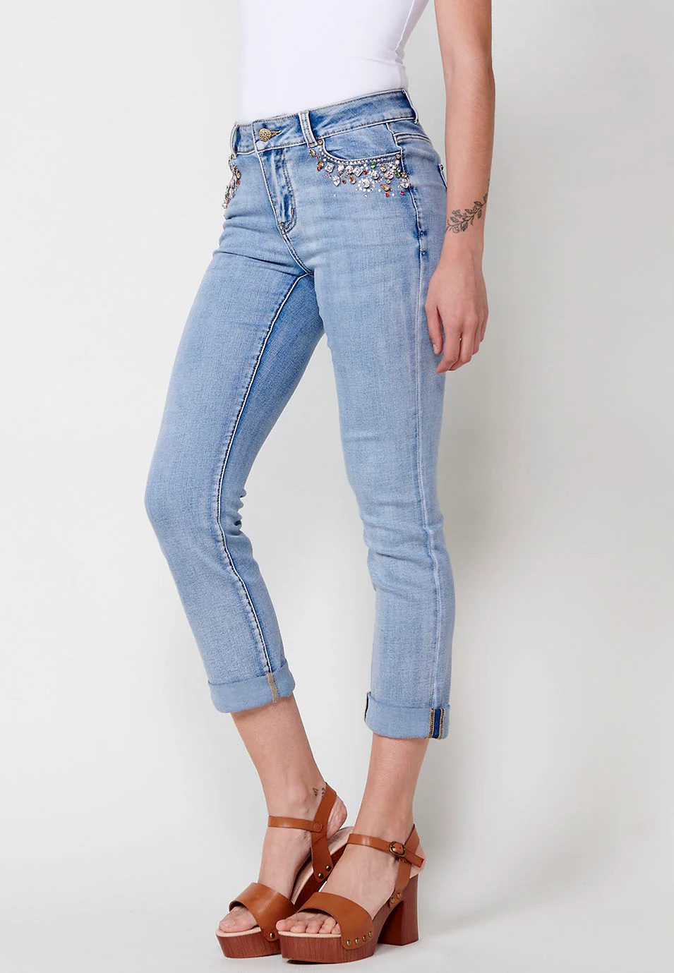 El diseño slim fit realza la figura, proporcionando una silueta estilizada y cómoda. El acabado en vuelta en los bajos añade un toque casual y contemporáneo, ideal para complementar tus looks urbanos o casuales. Además, los bolsillos delanteros están decorados con un delicado detalle de pedrería, que aporta un toque de brillo y elegancia al diseño, perfecto para mujeres que buscan prendas funcionales con un toque chic.