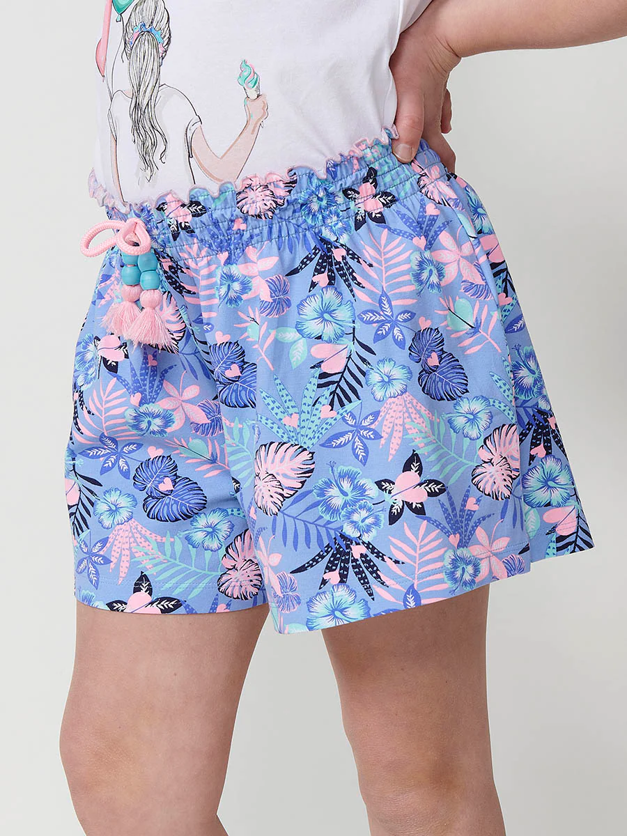 Short de niña efecto falda estampado azul con cintura paperbag