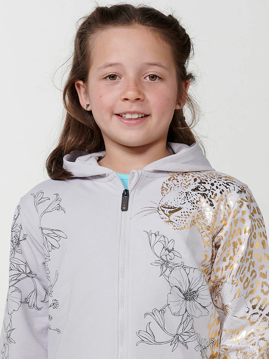 Sudadera de niña con capucha gris perla con tigre dorado y flores