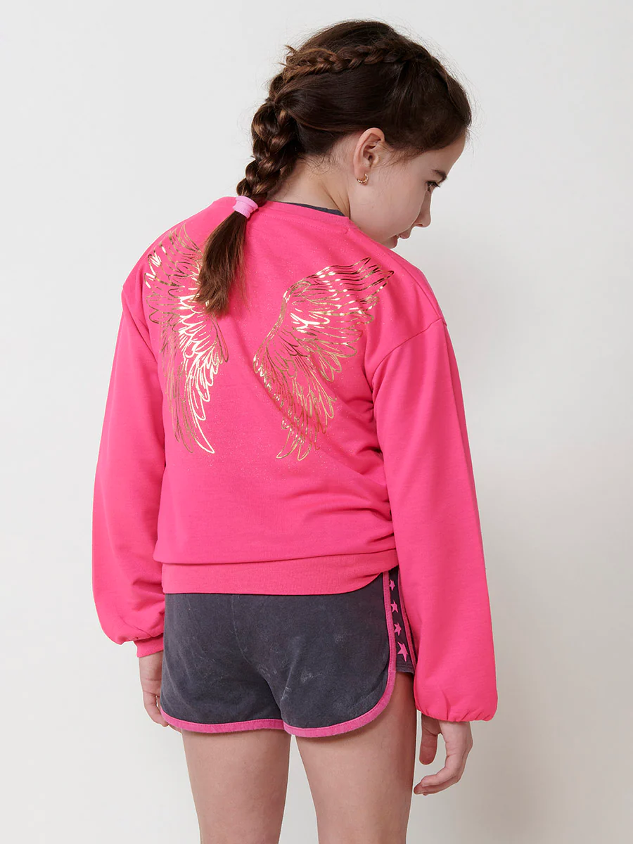Sudadera de niña fucsia con estampado de texto y alas